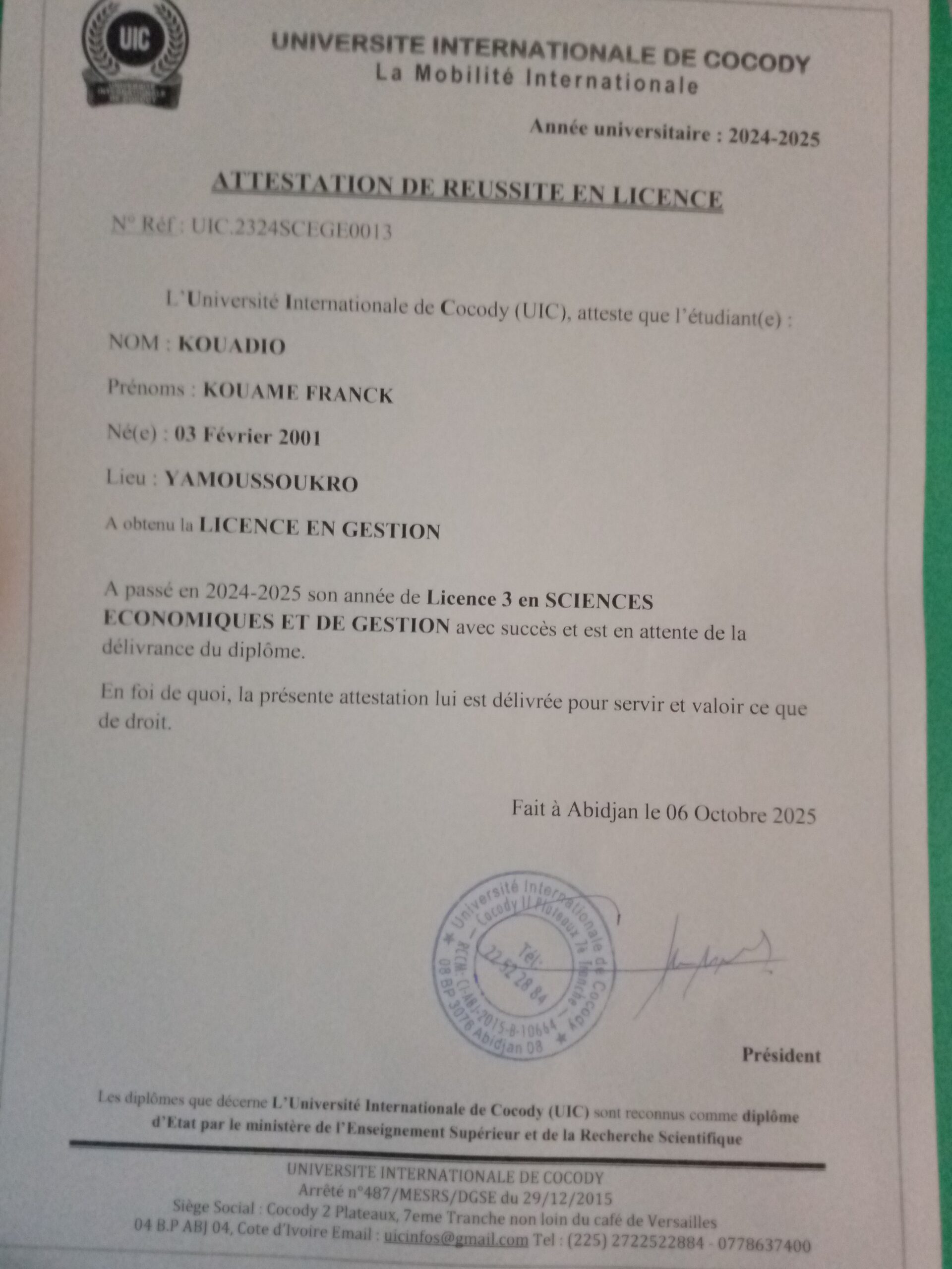 je diplômé d'une licence en sciences économiques et de gestion à l'Université Internationale de Cocody