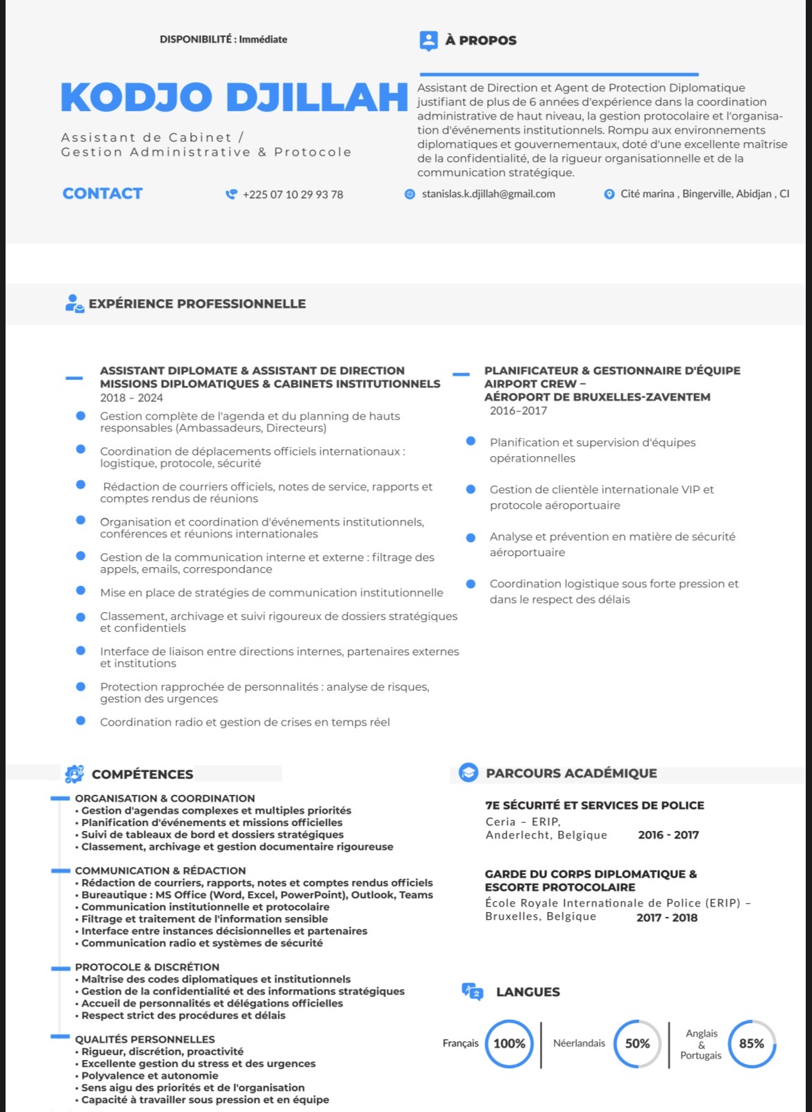 Stanislas.k.djillah@gmail.com Assistanat de Direction +32456013333 +32456013*** afficher Stanislas.k.djillah@gmail.com Ajouter aux favoris Télécharger le CV Expérience Compétences Formation Description Portfolio Distinctions Profi Portfolio